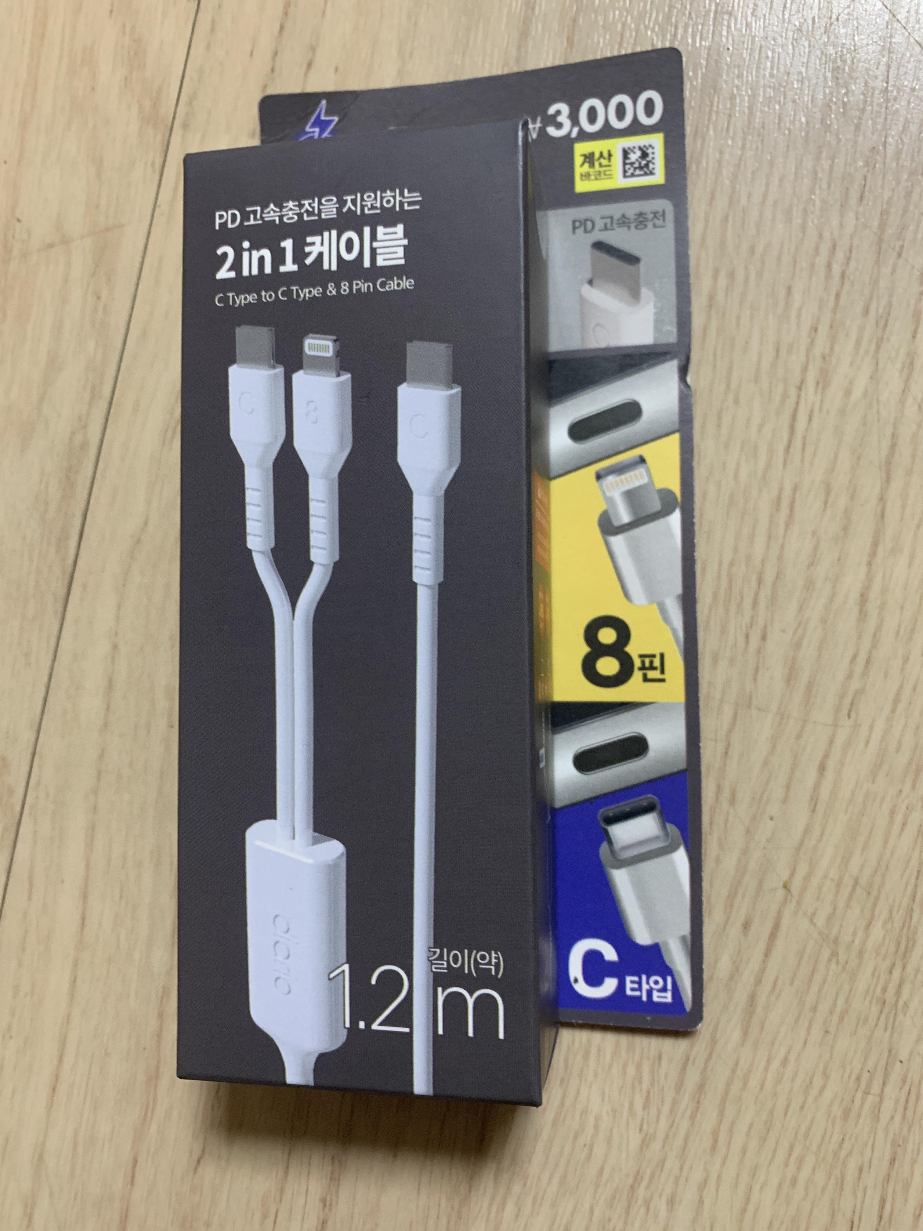 가격은 3천원이고, 2in1 고속충전 케이블 제품으로 C타입과 아이폰 8핀 모두지원이 된다.